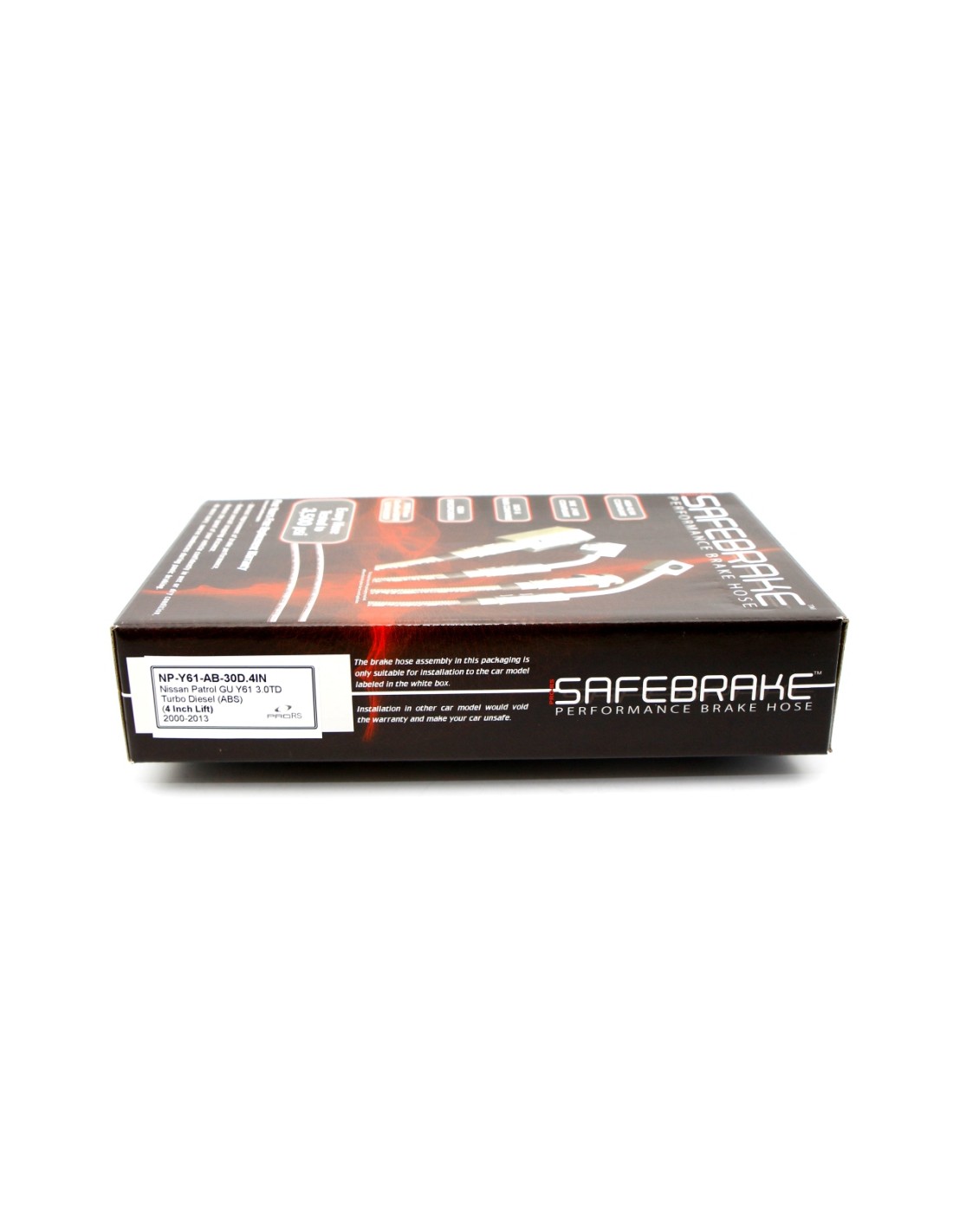 This SAFEBRAKE performance brake hoses kit suits 'PATROL GU Y61 3.0TD (ABS) (4 Inch Lift) 2000-2016'. This kit improves your car brake performance noticeably through the elimination of line expansion caused by the standard rubber brake hoses. Your car will be a joy to drive after the installation of SAFEBRAKE brake hoses kit.